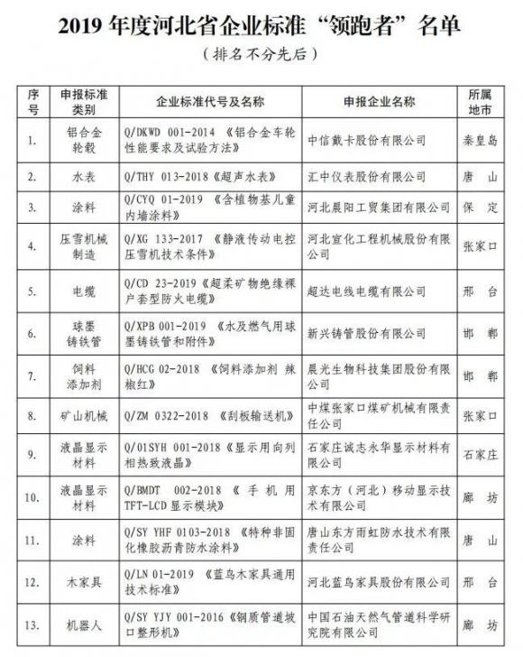 日前,河北省市场监督管理局发布《2019年度河北省企业标准“领跑者”名单》,晨……